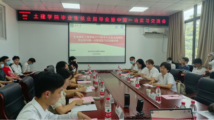 2022年9月8日星期四下午三点,9001cc金沙以诚为本2019级本科生就业指导动员会暨中国一冶集团实习交流座谈会在9001cc金沙以诚为本院办三楼第二会议室顺利举行,学院党委副书记王忠海、学工办主任余娟出席会议,此外,本次会议还邀请了合作单位中国一冶交通公司党委书记徐诉、中国一冶交通公司人力部部长蔡华、副部长熊璐等嘉宾。2019级有就业意向的同学也一起参与本次会议。会议由2019级学生辅导员、团委书记杨荷主持。
