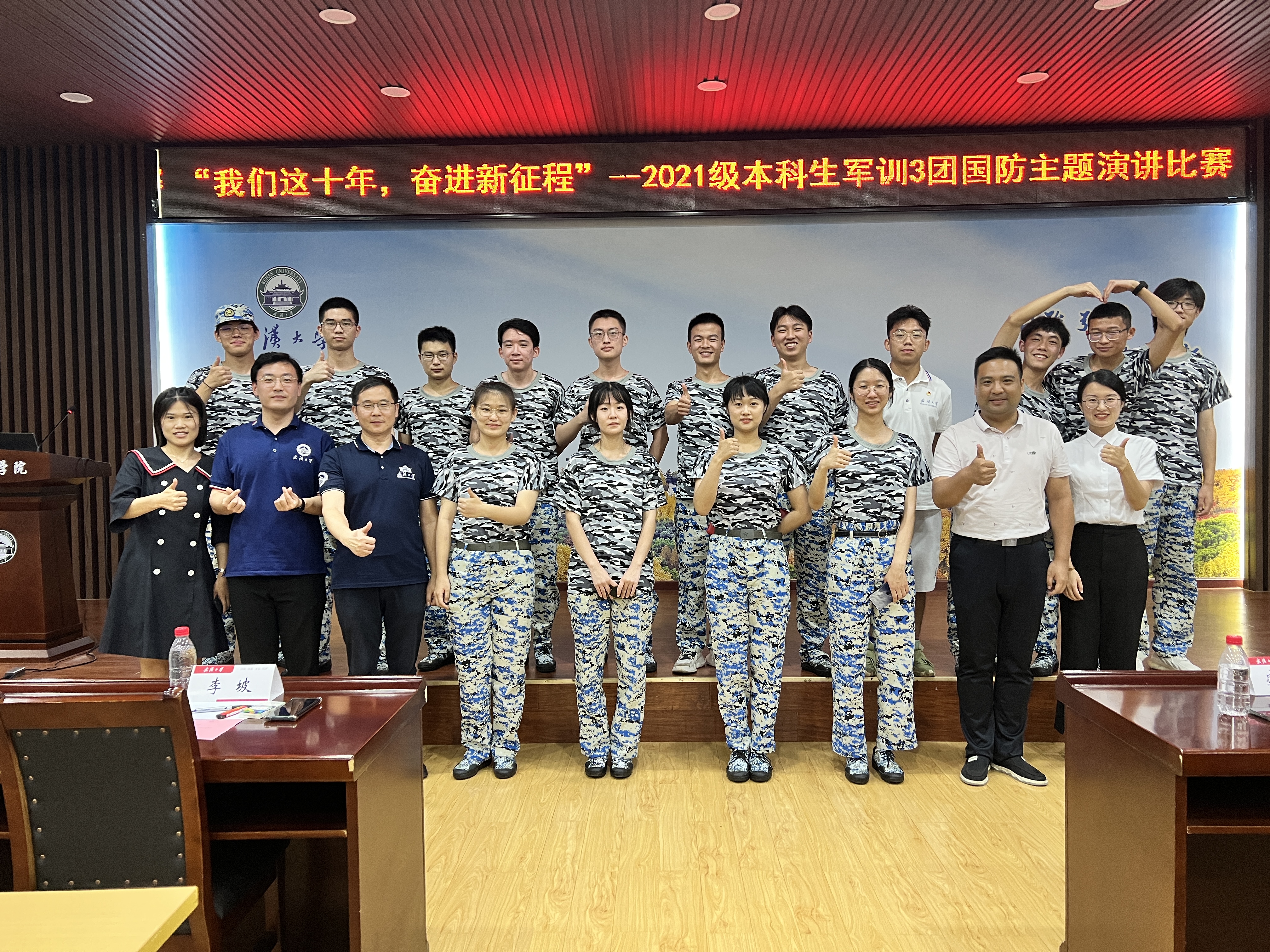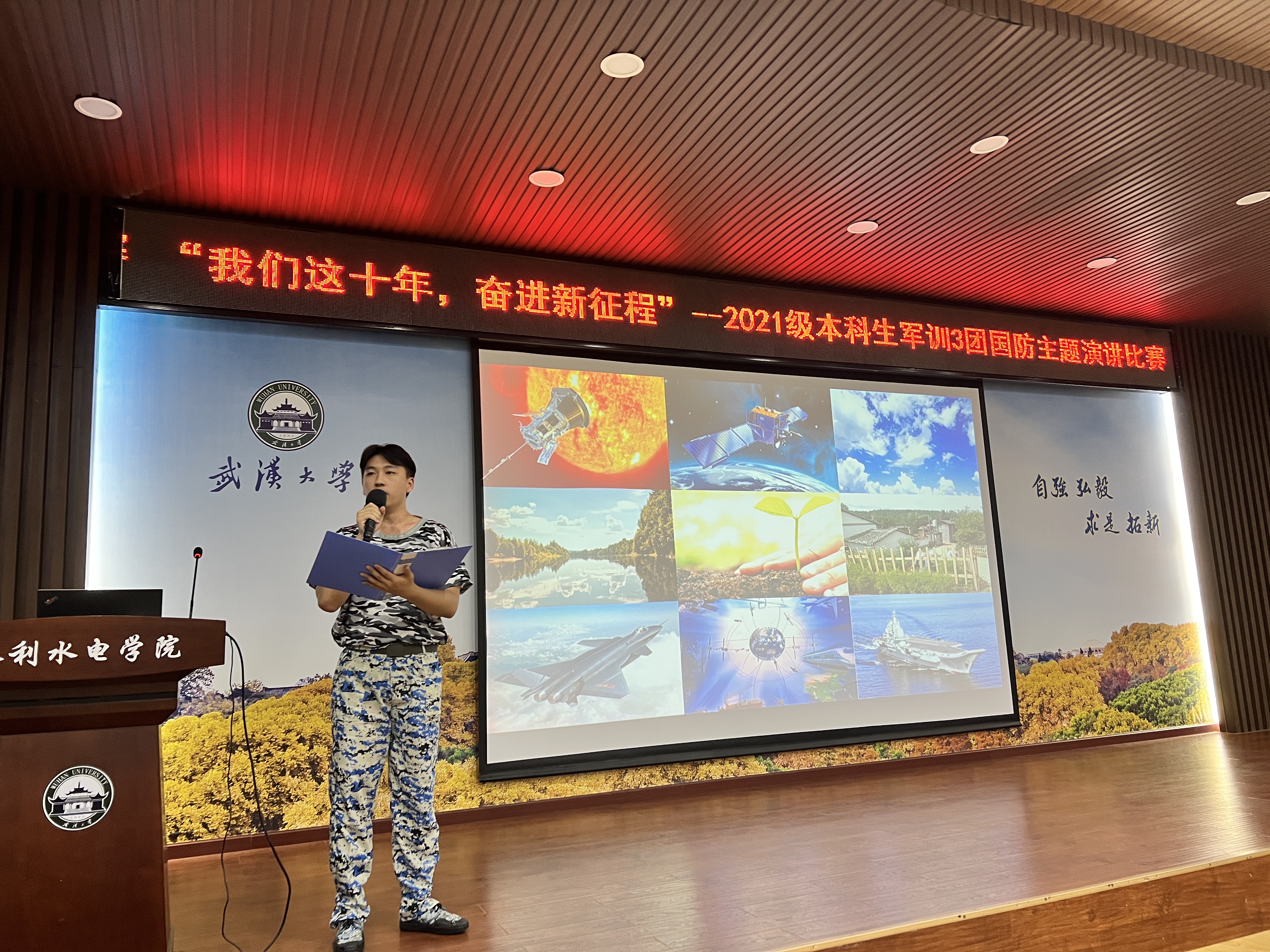 值此喜迎党的二十大胜利召开之际,为展示党的十八大以来青年眼中身边发生的新变化,进一步加我校学生国防教育与爱国主义教育,深入宣传伟大复兴新征程上走过的非凡十年,激发珞珈青年学子的爱国之情、报国之志、兴国之责,展现良好的精神风貌,6月21日晚,2021级军训三团在水利水电学院报告厅举行“我们这十年,奋进新征程”国防主题演讲比赛。出席此次比赛的嘉宾有动力与机械学院党委副书记李坡、9001cc金沙以诚为本党委副书记王忠海及军训三团各连指导员。